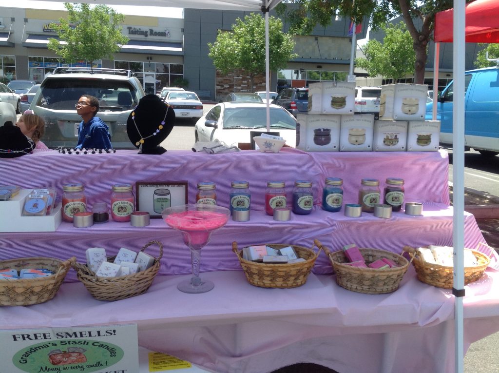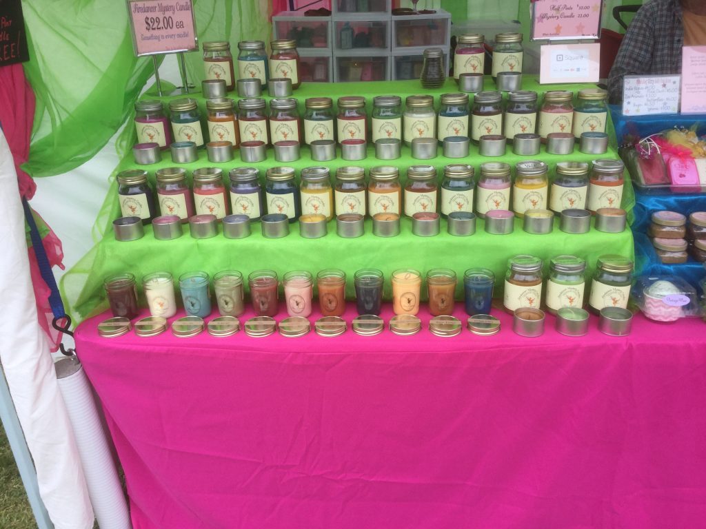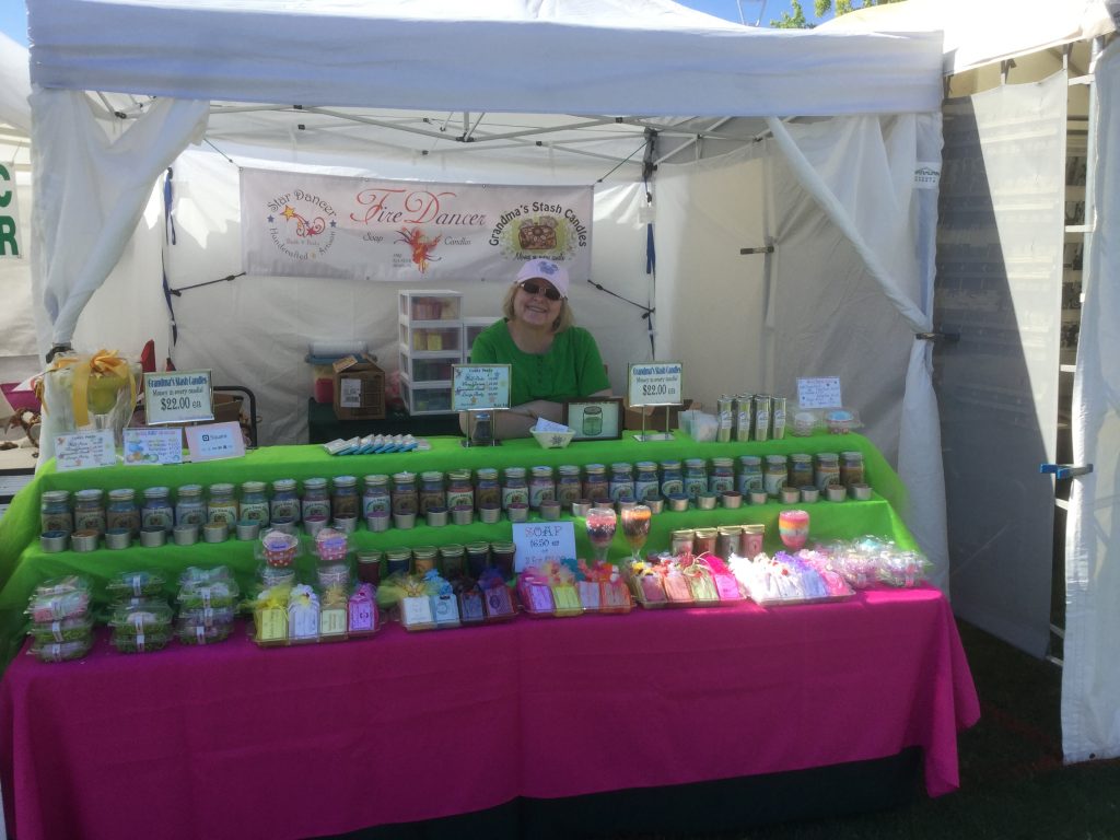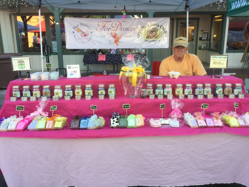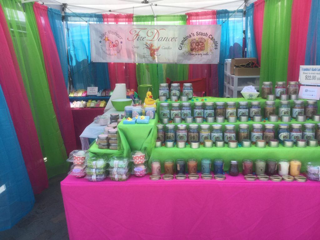We started out a little over 12 years ago at a local farmers market. We started out selling jewelry and then quickly pivoted to handpoured candles and then added handcrafted soap soon after. See pictures below of our first craft booth. and its evolution. Our now adult grandaughter and grandson hung out with us at most of our markets and became adept at customer service along the way.