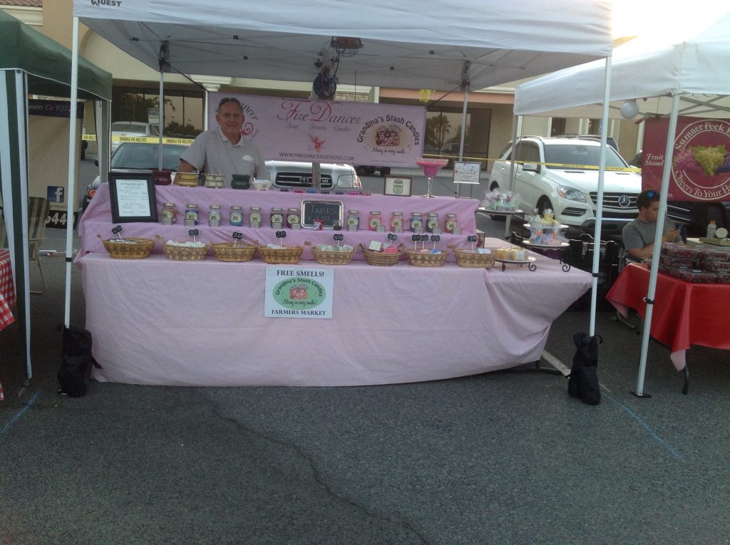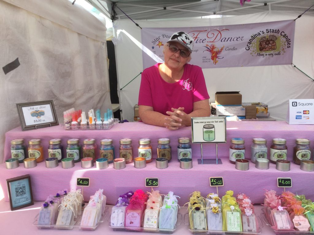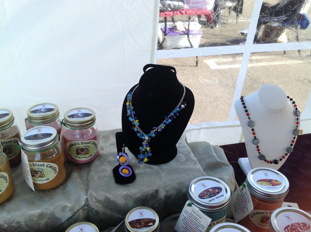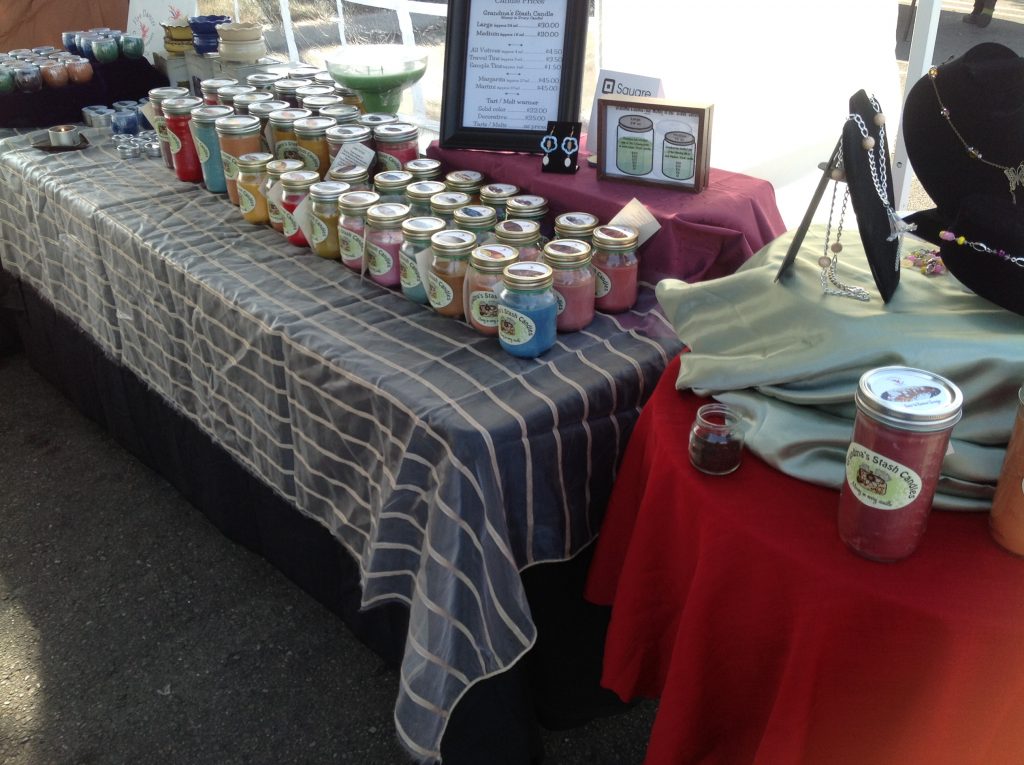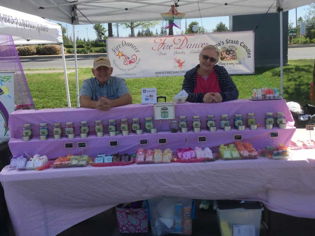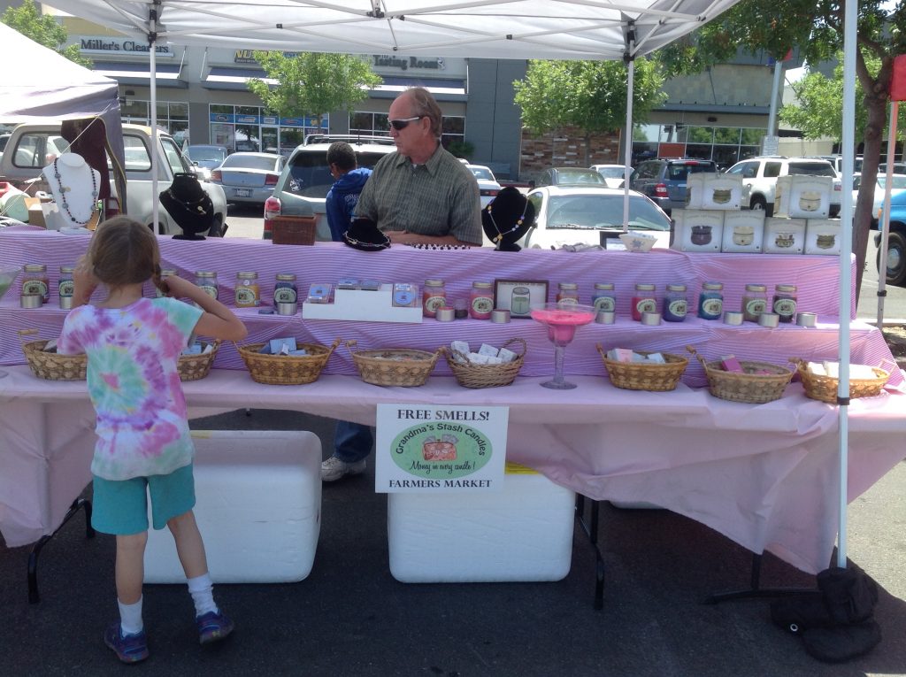 We started out a little over 12 years ago at a local farmers market. We started out selling jewelry and then quickly pivoted to handpoured candles and then added handcrafted soap soon after. See pictures below of our first craft booth. and its evolution. Our now adult grandaughter and grandson hung out with us at most of our markets and became adept at customer service along the way.